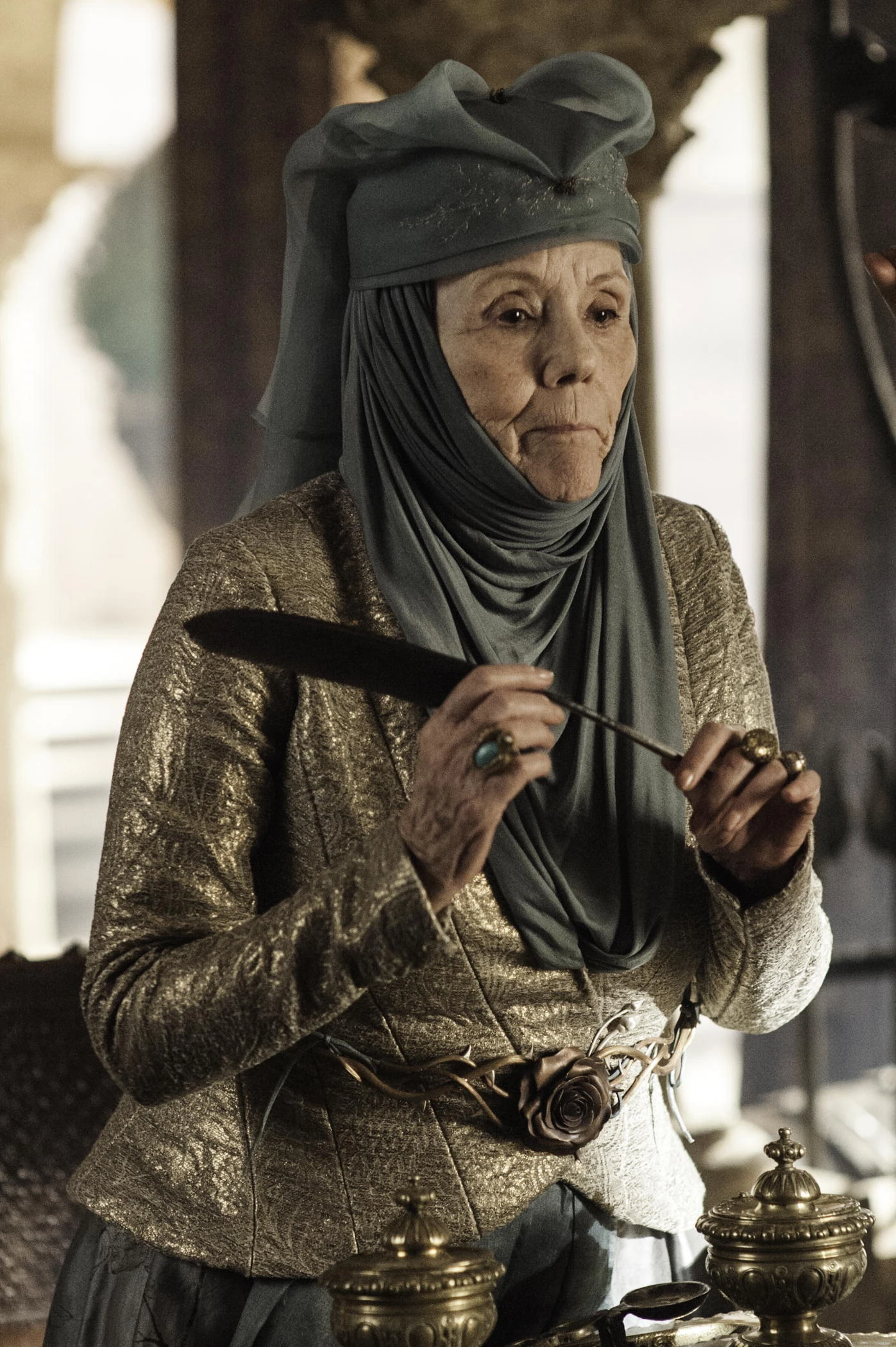 Lord Tywin Lannister pretende casar a Cersei con Loras Tyrell, el heredero de Altojardín. Olenna se niega, argumentando que Cersei es demasiado mayor, y no quiere arriesgar el futuro de la Casa Tyrell. Sin embargo, ante la amenaza de Lord Tywin de introducir a Loras en la Guardia Real, Lady Olenna no tiene más remedio que acceder.[6]